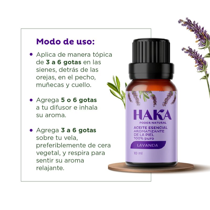 El aceite esencial de lavanda es ideal para ayudar a relajar y descansar. Se aplica de manera tópica en las sienes, detrás de las orejas, pecho, muñecas y cuello.