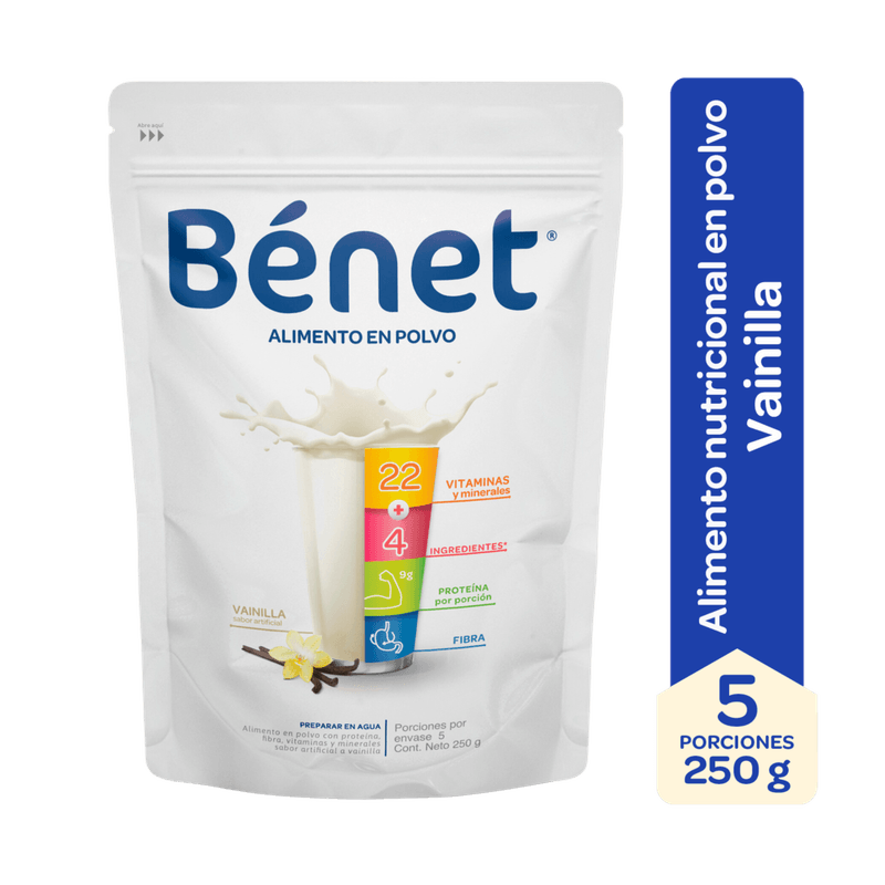 Alimento en polvo con proteína, fibra, minerales y excelente fuente de vitaminas.