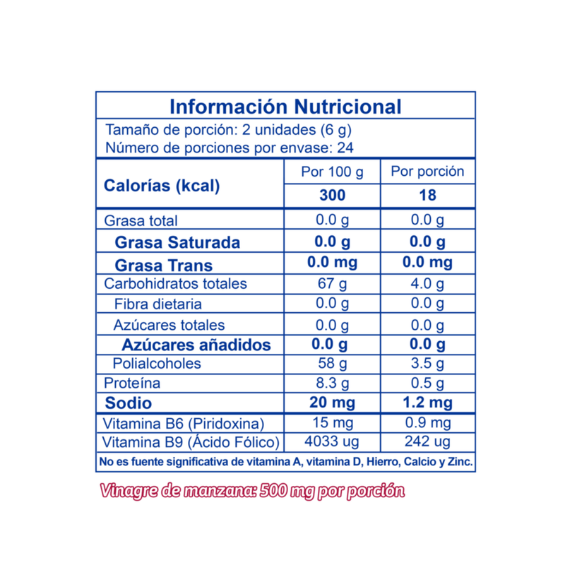 Gomas de gelatina, vinagre de manzana, vitaminas B6 y B9, sabor artificial a manzana