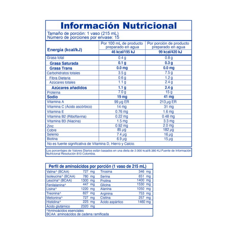 Aporta 15g de proteína de los cuales 10g provienen de la proteína de suero y 5g a partir de péptidos de colágeno.