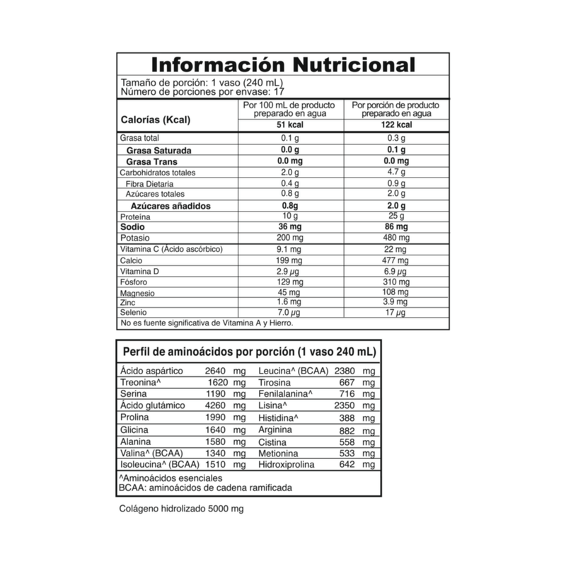 Aporta 25g de proteína de los cuales 20g provienen de la proteína de suero y 5g a partir de péptidos de colágeno hidrolizado.